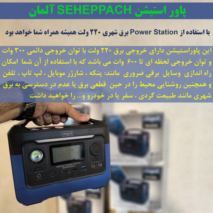 با استفاده از Power Station ها برق شهری 220 ولت همیشه همراه شما خواهد بود. پاور استیشن SEHEPPACH آلمان با ظرفیت باتری داخلی 72.800 میلی آمپر ساعت ، می تواند در رنج قیمتی مناسب خود ، یکی از بهترین انتخاب ها باشد. این پاوراستیشن دارای خروجی برق 220 ولت با توان خروجی دائمی 300 وات و توان خروجی لحظه ای تا 600 وات می باشد (حین شروع به کار دستگاه ها در لحظه اول گاها آمپر مصرفی بالا تر از حالت عادی است که عدد نوشته شده روی وسایل برقی ، حداکثر میزان مصرف آنهاست) که با استفاده از آن شما امکان راه اندازی وسایل برقی ضروری مانند: روشنایی محیطی ، پنکه ، شارژر موبایل ، لپ تاپ ، تلفن کامپیوتر ، پرینتر و ... را در حین قطعی برق یا زمان های عدم در دسترسی به برق شهری مانند طبیعت گردی ، سفر یا در خودرو و... را خواهید داشت. همانطور که در تصاویر محصول مشاهده می کنید این پاوراستیشن دارای یک خروجی برق 220 ولت می باشد که البته می توان آن را به چند راهی های برق متصل نمود و تعداد بیشتری از آن پریز برق ایجاد کرد. همچنین 1 پورت Type-C و 2 پورت USB و یک پورت USB.3 Fast charge روی این پاوراستیشن قرار دارد. یک چراغ قوه نیز بعنوان روشنایی با مصرف برق بسیار پایین نیز روی آن قرار دارد. 2 خروجی 12 ولت و یک پورت شارژر فندکی نیز در طرف دیگر دستگاه مشاهده می شود. همچنین دستگاه دارای فن خنک کننده است که فقط در مواقع لازم بصورت اتوماتیک روشن شده و پس از رسیدن دستگاه به دمای ایده آل خاموش می شود. روی صفحه نمایشگر این پاور استیشن اطلاعات لازم درج شده است. میزان درصد شارژ باتری داخلی و وات مصرفی در لحظه محاسبه و نمایش داده می شود. وزن تقریبی 3.2 کیلوگرم و ابعادی کوچک با دسته ای مقاوم حمل و استفاده از آن را بسیار آسان ساخته است. با توجه به قرارگیری 28 عدد باتری لیتیومی با ولتاژ 3.7 ولت ظرفیت دستگاه 72.800 میلی آمپر می باشد که عددی بسیار قابل قبول است