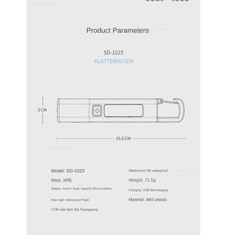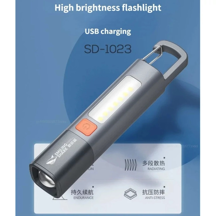 معرفی چراغ قوه چراغ قوه دستی Smiling Shark مدل SD-1023 با طرح قلاب عرضه می شود که به راحتی می توان آن را روی چادر یا سایر تکیه گاه ها آویزان کرد. روشنایی مناسب را می توان با توجه به نیاز شما انتخاب کرد. چراغ قوه چراغ قوه دستی Smiling Shark مدل SD-1023 از مواد ABS ساخته شده است که با وزن کم حمل آن آسان است و در هر زمان به راحتی قابل استفاده میباشد.این چراغ قوه دارای روشنایی بالا و LED COB برد طولانی است که نور پرتو قدرتمند و متمرکزی را برای دید بهتر در تاریکی فراهم می کند.این چراغ قوه که با مواد با کیفیت ساخته شده است، بادوام است و برای فعالیت های مختلف در فضای باز مانند کمپینگ، پیاده روی و مواقع اضطراری مناسب است.چراغ قوه دستی Smiling Shark مدل SD-1023 با اندازه جمع و جور و قابل حمل طراحی شده است که حمل و نگهداری را برای ماجراجویی در فضای باز شما آسان می کند.با عملکرد فوکوس قابل تنظیم آن، می توانید به راحتی بین یک پرتو باریک و متمرکز یا یک نور افکن گسترده و پراکنده سوئیچ کنید و با نیازهای مختلف نوری خود را برطرف کنید.چراغ قوه مجهز به طراحی قلاب است که به شما امکان می دهد به طور ایمن به کوله پشتی یا حلقه کمربند خود بچسبانید و دسترسی به آن را آسان میسازد و از گم شدن شما جلوگیری میکند. این چراغ قوه دارای باتری لیتیومی است که از طریق درگاه USB قابلیت fast charging را دارد. دارای دکمه ی خاموش و روشن است و دارای 3 حالت است که با هربار فشار دادن آن این امکان را به شما میدهد که نور مورد نیاز و مورد استفاده خود را تنظیم کنید.