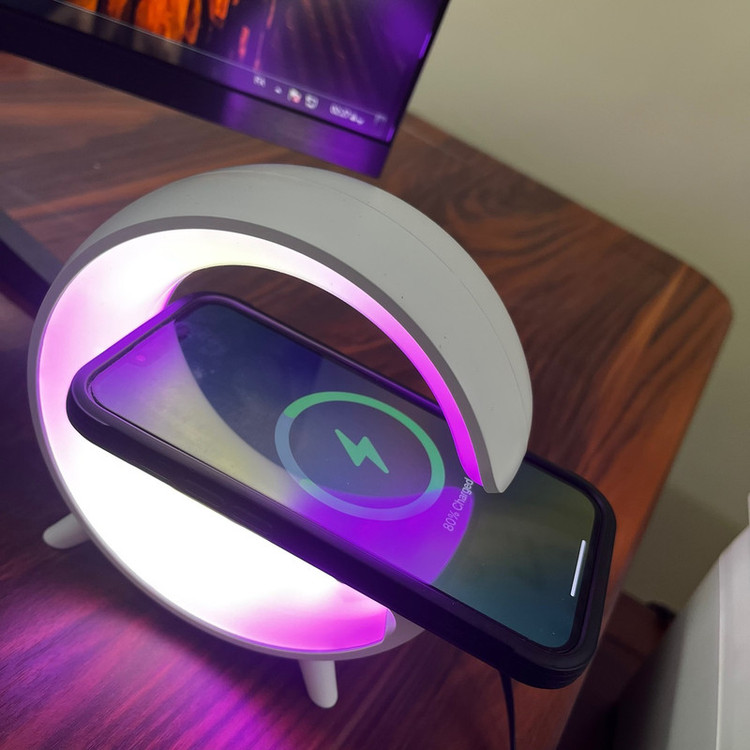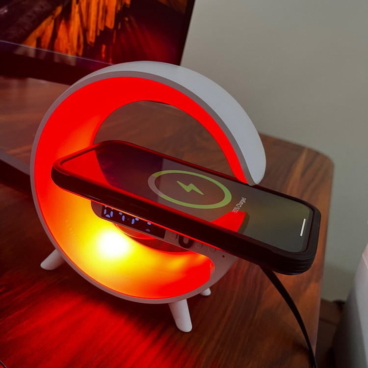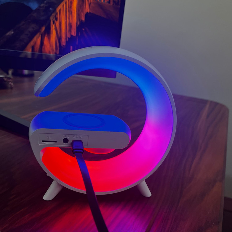 چراغ خواب هوشمند RGB مدل G63 طرح اسپیکر دار ، یک گجت چندکاره است که علاوه بر یک چراغ خواب جذاب با افکت های نوری RGB ، قابلیت نمایش ساعت و تنظیم ساعت بیدار شدن و کوک کردن ساعت و همچنین قابلیت شارژ کردن وایرلس موبایل را دارد . از قابلیت جذاب دیگه این محصول که آن را خاص میکند ، اسپیکر های این چراغ خواب است که میتوانید قبل از خواب موزیک دلخواه خودتون رو از طریق بلوتوث پخش کنید. برای تنظیم ساعت این دستگاه کافیه یکبار به یک تلفن همراه (از طریق بلوتوث) متصل کنید تا ساعت دستگاه تنظیم شود . این دستگاه برای روشن شدن نیاز به آداپتور 20 وات دارد که میتوانید از آداپتور های موبایل این وسیله را شارژ و یا روشن کنید.